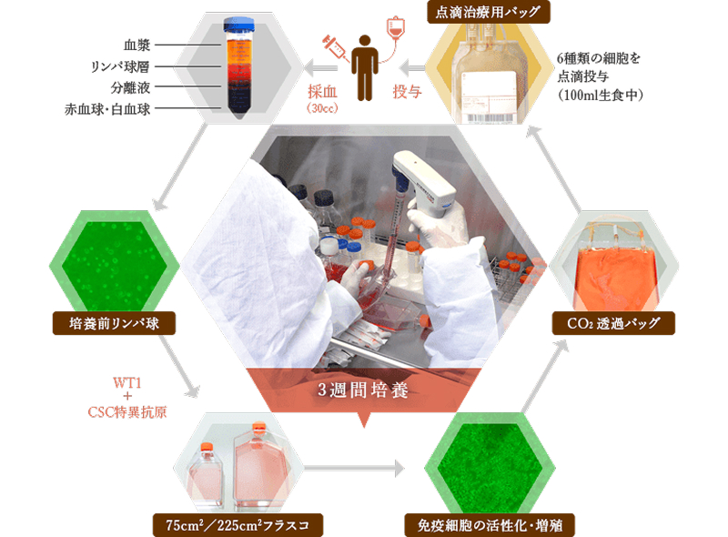 その中で、最初に抹消血中のリンパ球とNK細胞をフラスコの中で活性化・増殖させる培養方法を発見し、その後「NKT細胞」「γδ(ガンマ・デルタ)T細胞」「樹状細胞」「ヘルパーT細胞」を加えた6種類の細胞を同時に活性化・増殖させることに成功したことにより、現在の6種複合免疫療法が確立されました。
